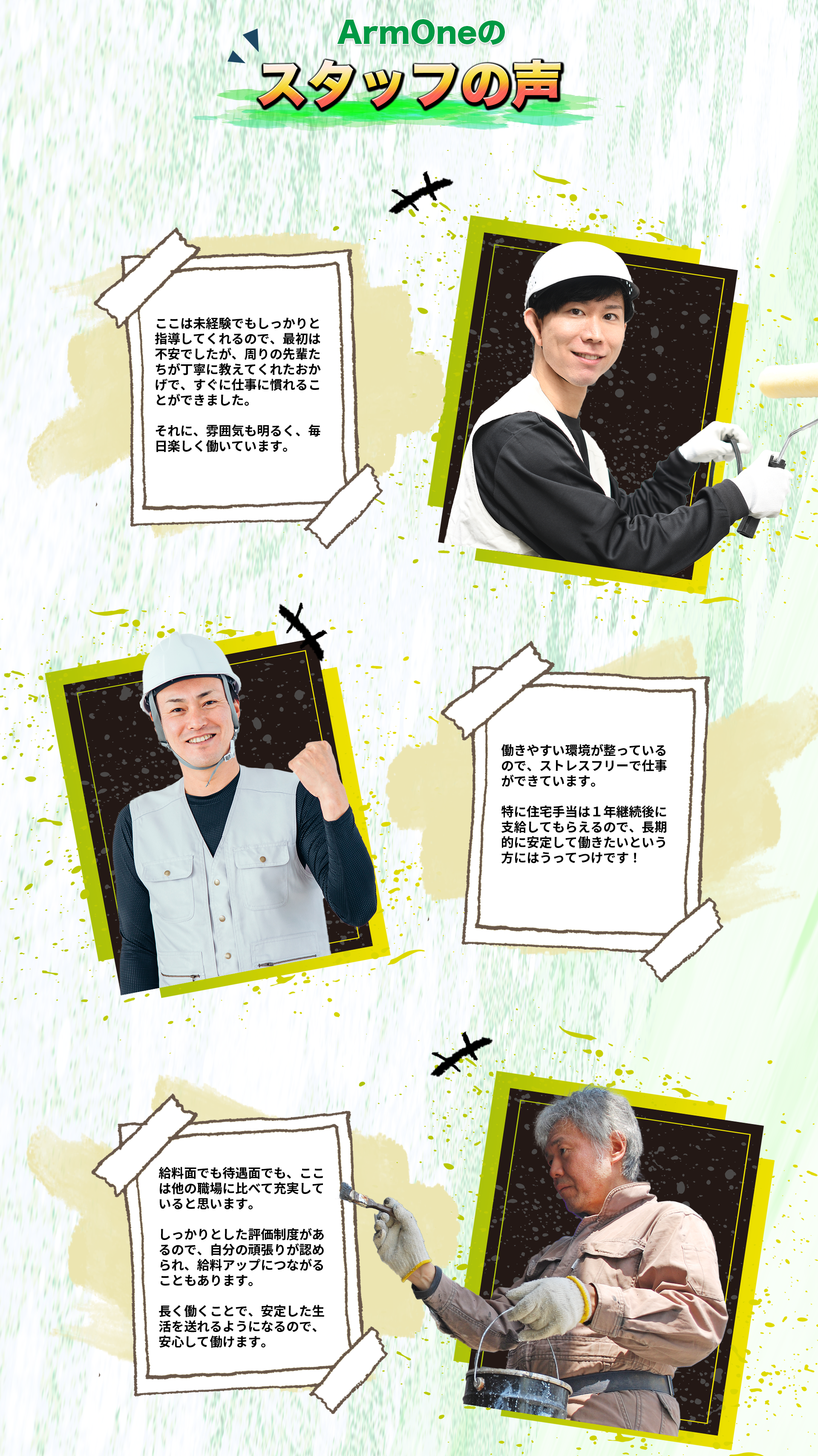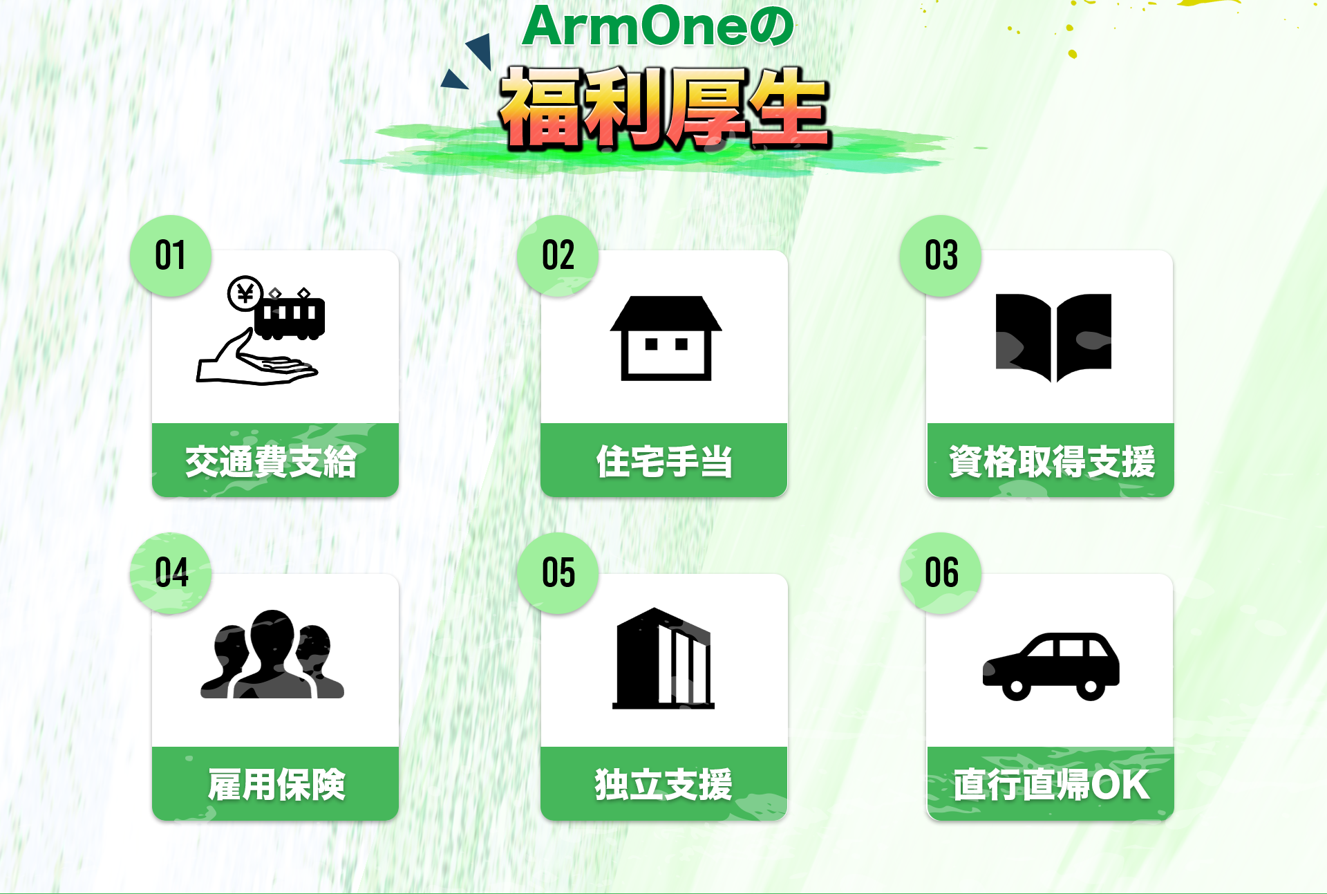 | 待遇 | ・雇用保険 ・資格取得補助制度完備 ・住宅手当 ※一年以上継続で支給 ・独立支援制度 |